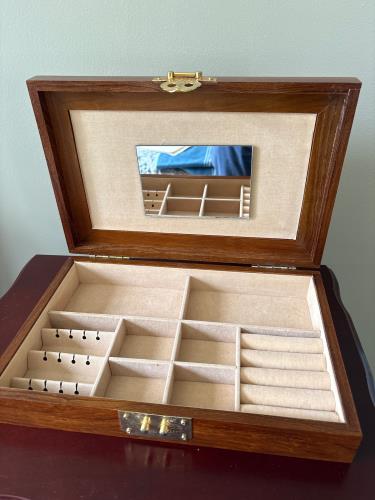 This exquisite wooden jewelry box features a plush velvet interior with multiple compartments, perfect for organizing rings, necklaces, and other accessories. The built-in mirror adds a touch of elega...
