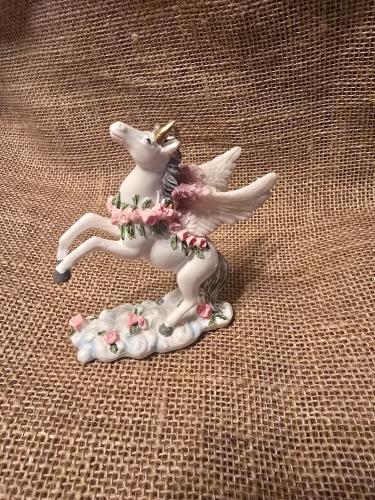 This charming ceramic Pegasus figurine is beautifully crafted with delicate floral accents and a gold-tipped horn, adding a touch of whimsy to any space. The hand-painted detailing and pastel colors e...
