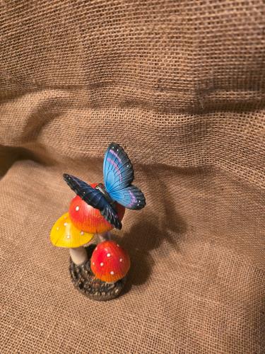 This charming ceramic figurine features a vibrant blue butterfly perched atop a cluster of colorful red and yellow mushrooms. Perfect for adding a whimsical touch to any shelf or garden setting, this ...