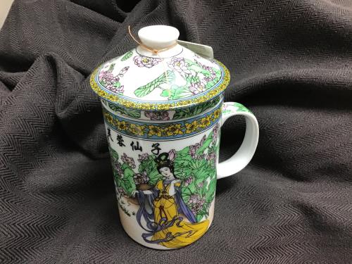 This exquisite Chinese porcelain infuser mug is beautifully adorned with traditional Chinese figures and floral motifs in vibrant colors. The matching lid adds elegance and helps maintain the temperat...