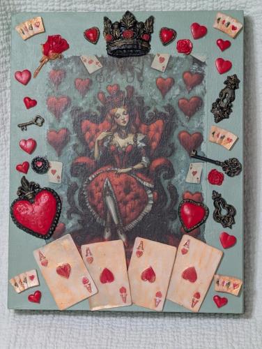 Embrace the whimsy of Wonderland with this Queen of Hearts decorative plaque. Featuring intricate designs and embellishments such as red hearts, playing cards, keys, and a regal crown, this piece adds...
