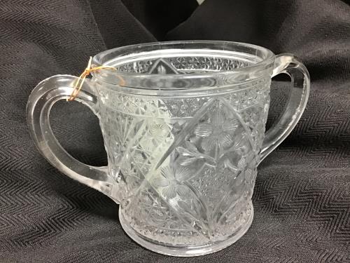This exquisite early American pressed glass spooner features intricate floral and geometric patterns that capture the light beautifully. Its dual handles complement its sturdy, yet elegant design, mak...
