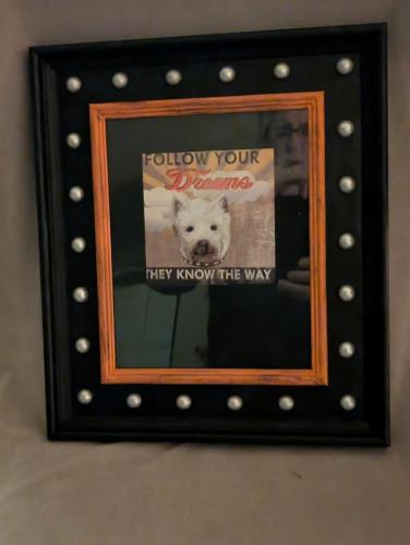 This charming framed portrait captures the essence of inspiration with its endearing depiction of a dog adorned with a pearl collar, complemented by the motivational saying, "Follow your dreams, they...