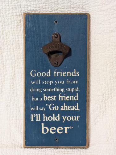 This charming bottle opener not only serves a practical purpose but also warms the heart with its inscribed message, "Here’s to a Good Friend." Crafted from wood with a weathered finish, this piece pr...