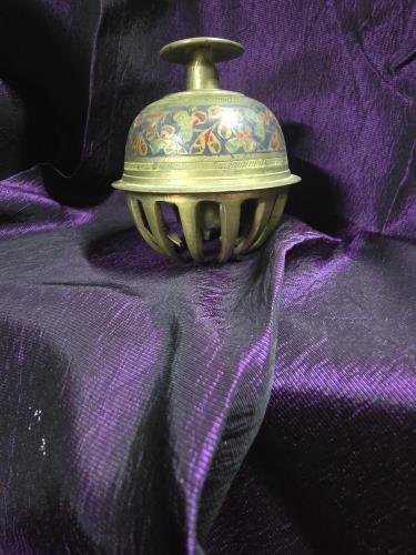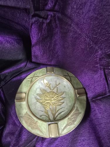 This vintage brass ashtray features intricate floral engravings with lovely enamel accents. Its exquisite design highlights a harmonious blend of functional craftsmanship and decorative appeal. Perfec...