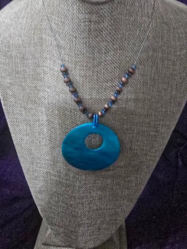 This striking vintage necklace features a bold blue circular pendant, elegantly suspended from a unique beaded chain. The combination of lustrous blues and subtle earthy tones in the beads adds a soph...