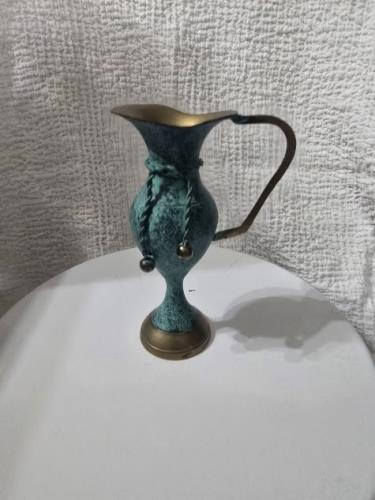 This elegant vintage ewer vase is crafted from brass and features a striking patina finish that adds to its antique charm. The vessel has an ornate design with a slender handle and decorative rope det...
