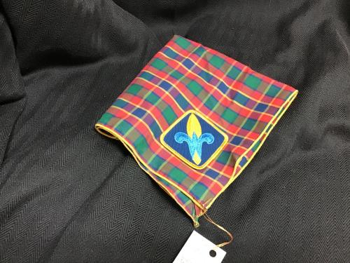 This classic vintage Boy Scouts neckerchief features a traditional plaid pattern with a prominent blue and gold fleur-de-lis patch emblem. A nostalgic piece for collectors or scouting enthusiasts, it ...
