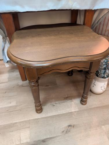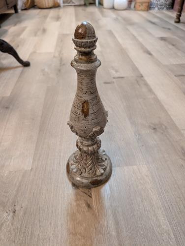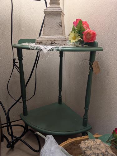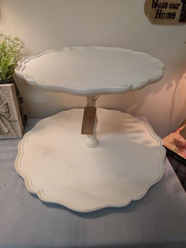 This charming vintage two-tiered wooden stand features a classic whitewashed finish, perfect for adding a touch of rustic elegance to your home decor. Its scalloped edges and sturdy central support ma...