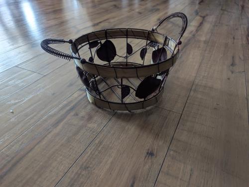 This charming vintage fruit basket features a rustic wire frame adorned with wooden accents and decorative grapevine motifs. Perfect for adding a touch of farmhouse charm to your kitchen or dining roo...