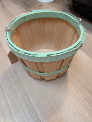 This charming vintage wooden bushel basket is perfect for a rustic farmhouse decor. Featuring a classic design with light green accents, it's ideal for storage or as a decorative piece. Its sturdy con...