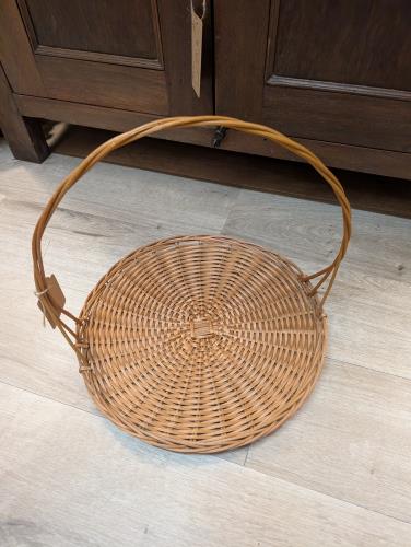 This charming vintage wicker basket features a sturdy handle and a beautifully woven round base. Perfect for picnics, storage, or as a decorative piece in your home, this basket adds a touch of rustic...