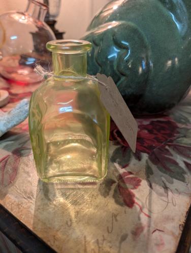 This charming vintage uranium glass bottle features a delightful pale green hue that glows under UV light. Its petite, elegant design makes it a perfect addition to any collection of antique glassware...