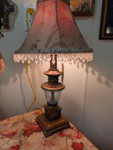 Illuminate your space with this elegant vintage table lamp, featuring a beautifully crafted fabric shade adorned with intricate floral patterns and a charming crystal fringe. The base showcases a clas...
