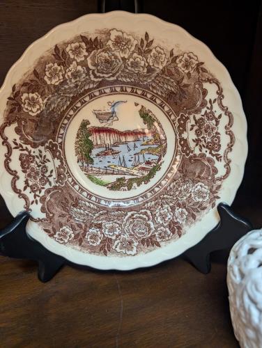 This exquisite vintage transferware plate features a charming scenic design with detailed floral borders and a central image depicting a serene lakeside view with sailboats and a cascading waterfall. ...