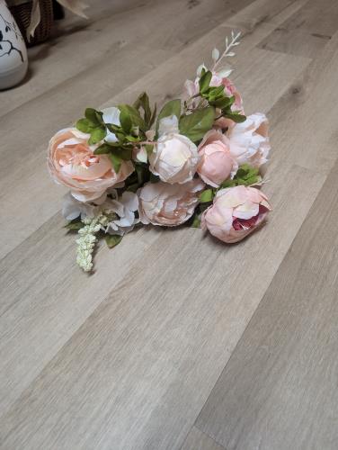 This elegant faux peony floral arrangement features soft pink and cream petals complemented by lush green leaves. Perfect for adding a touch of spring to your home decor, these realistic silk blossoms...