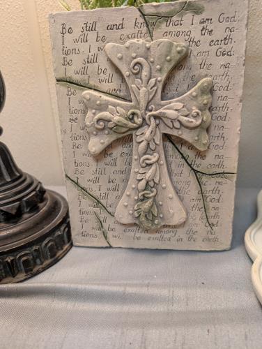 This elegant wall plaque features an intricately designed cross set against a textured backdrop of inspirational text. The raised cross is adorned with ornate leaf and scroll details, adding a touch o...