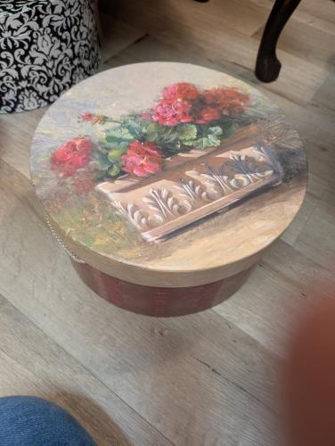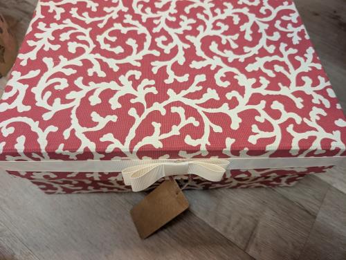 This charming decorative storage box is adorned with a vibrant coral and white floral pattern, perfect for adding a touch of elegance to any room. The fabric covering is enhanced with a delicate ribbo...