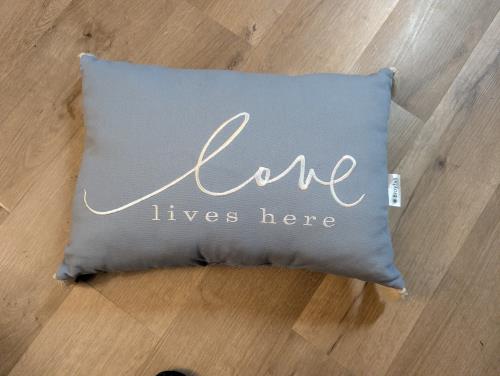 This charming decorative throw pillow adds warmth to any space with its heartfelt message, "Love Lives Here." Featuring a soft gray fabric and elegant script embroidery, it's the perfect accent piece ...