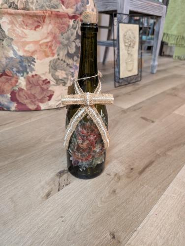 This unique decorative piece is crafted from a vintage-style dark glass bottle, elegantly adorned with a dried floral arrangement that encapsulates rustic charm. The bottle is wrapped with a burlap ri...