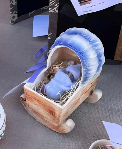 blue boy maus inside vintage German cradle with bonnet