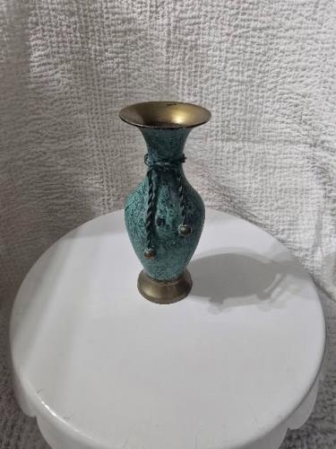 This striking mid-century vase features a unique combination of brass and textured green enamel, showcasing a vintage charm. The vase is adorned with braided rope detailing, adding an element of elega...