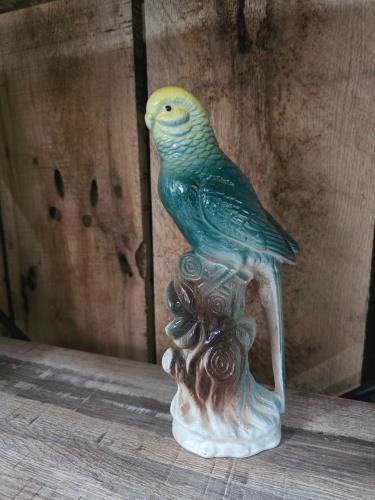 This charming vintage ceramic parakeet figurine captures the vibrant colors and beauty of the beloved bird. Featuring a glossy finish with intricate detailing, the figure perches gracefully atop a scu...