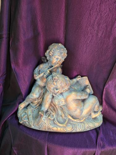 This charming vintage statue depicts two cherubic figures, one playing a flute, creating an enchanting scene of musical bliss. Expertly crafted with intricate details, the piece exudes timeless elegan...