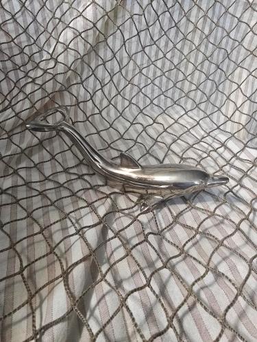 This elegant vintage bottle opener, shaped like a sleek dolphin, is crafted from chrome-plated metal. Its streamlined design is both functional and decorative, making it a charming addition to any bar...