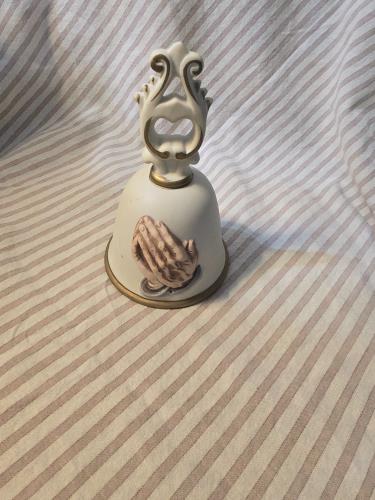 This vintage ceramic bell features a delicately crafted handle and a beautiful depiction of praying hands, symbolizing peace and spirituality. The soft ivory tone is accented with subtle gold detailin...