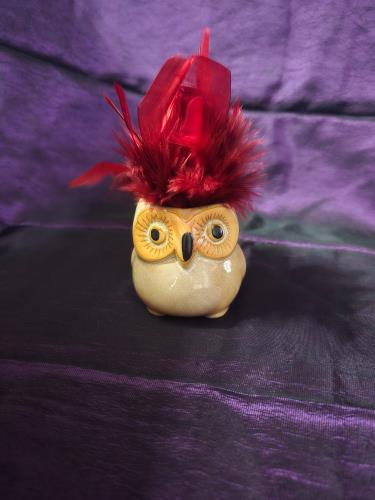 This charming vintage owl figurine is crafted from ceramic, featuring wide eyes and a whimsical feathered hat in vibrant red. Perfect as a quirky addition to any collection, this delightful piece stan...