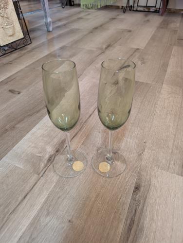 This elegant pair of vintage green stemmed champagne flutes adds a touch of sophistication to any collection or celebration. Featuring a sleek design with subtle green hues, these flutes are perfect f...