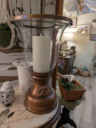 Add a touch of elegance to your home with this vintage glass and copper hurricane candle holder. Featuring a classic flared glass design seated on a copper base, this piece is ideal for creating ambie...