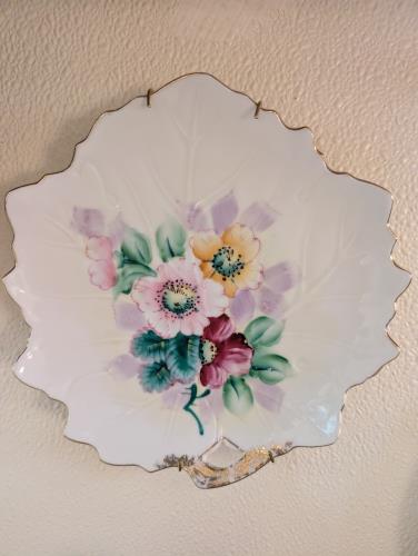 This exquisite vintage porcelain plate features a unique leaf shape adorned with vibrant hand-painted floral motifs. The delicate blend of pink, yellow, and green hues, accented with subtle gold trim,...