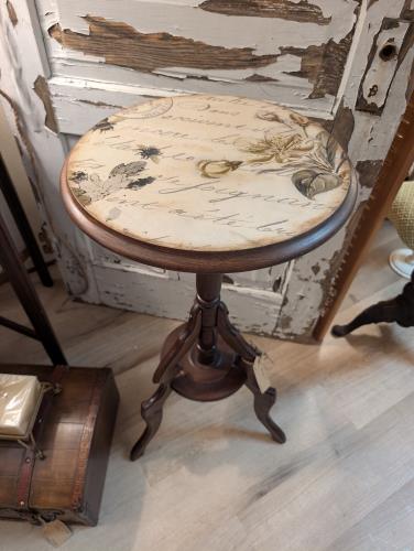 This charming vintage plant stand features a beautifully detailed French script design on its circular top, adding a touch of elegance to any room. The sturdy, carved wooden pedestal and tripod base p...