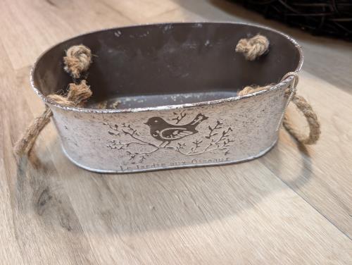 Add a touch of rustic charm to your home with this vintage French-style metal planter tray. Featuring an elegant bird and branch design with the inscription "Le jardin aux Oiseaux," it brings a countr...